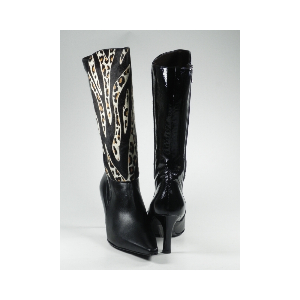 -Designul cizmelor este unul chic, cu fata din piele box, piele lacuita si piele cu par de ponei cu print tigrat. Au varful ascutit, talpa subtire si inchidere cu fermoar pe interior. Potrivite unei tinute cu fusta sau rochie, pentru a pune in evidenta eleganta modelului.
